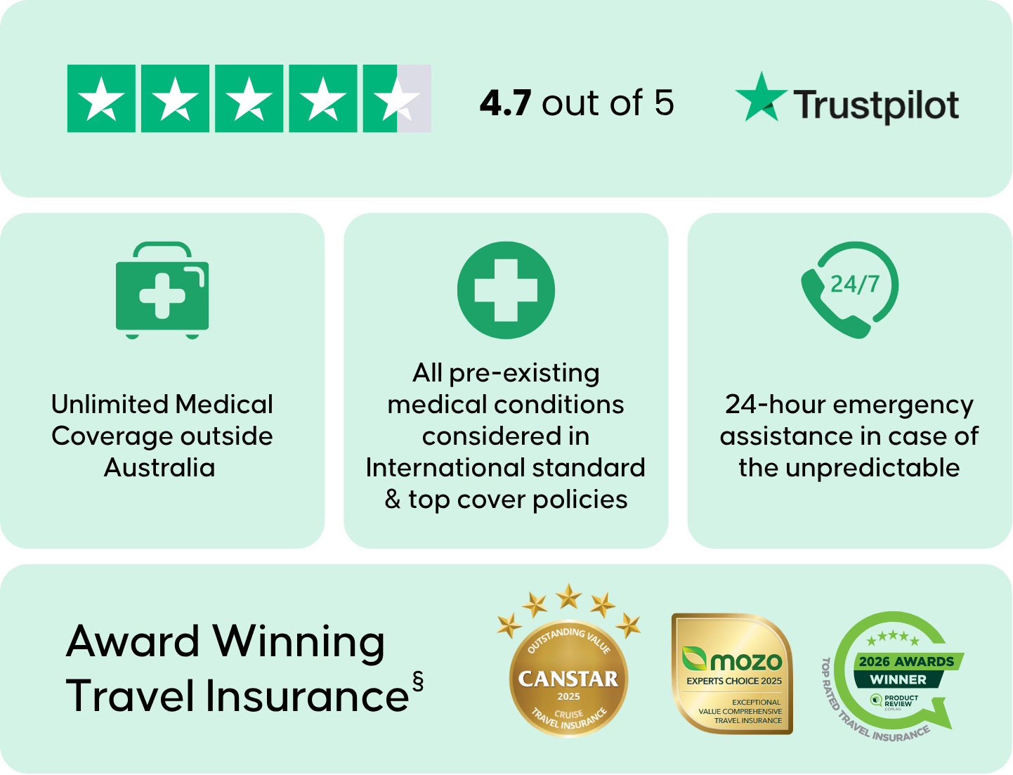 - Tick Travel Insurance has been recognised with multiple awards*: the 2026 Product Review Award; Canstar 2025 Award for ‘Outstanding Value – Cruise Travel Insurance’ & 2024 Award for ‘Outstanding Value – International Travel Insurance’