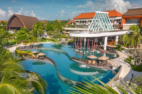 This five-star tropical resort, perched on the palm-fringed shores of Nusa Dua’s sought-after Mengiat Beach, boasts a glittering multi-level swimming pool, panoramic views and opulent rooms, suites and villas inspired by traditional Balinese style.