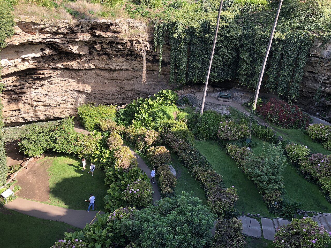 Walking down into the sinkhole is part of the magic. From the top, you get that dramatic “wow” moment looking over the edge, but as you descend the steps, the space opens up into a peaceful, almost storybook-like garden. Ferns, hydrangeas and towering trees surround you, while vines drape down the limestone walls, giving it a hidden-world feel that’s hard to replicate anywhere else.