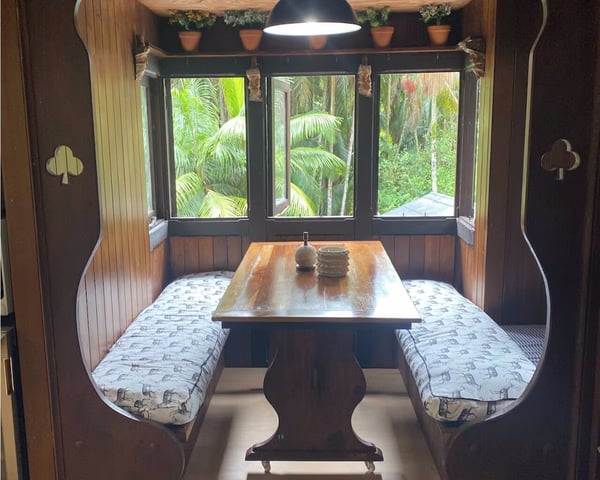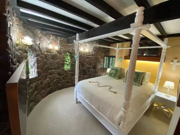 Right on this leafy doorstep sits the Botanic Gardens Castle Retreat itself, a private accommodation designed to feel like a fantasy castle softened by nature. The property features stone textures, warm timber interiors, and a light-filled greenhouse-style sunroom that looks out into rainforest greenery. Guests get exclusive use of the home, which includes multiple themed bedrooms, a cosy fireplace lounge, and communal spaces designed for slow mornings, shared meals, and birdwatching with visiting king parrots.