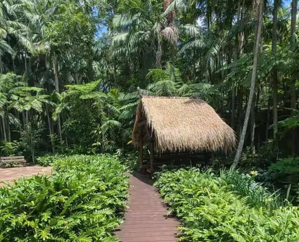 What really makes the experience stand out is the contrast: you’re sleeping in a castle-inspired hideaway while literally stepping out into a living botanical landscape that has been shaped by decades of community care. Morning coffee comes with mist drifting through palms, afternoons might include wandering fern-lined paths just metres away, and evenings feel like a slow fade into rainforest quiet—broken only by wind through the trees and the occasional birdcall.